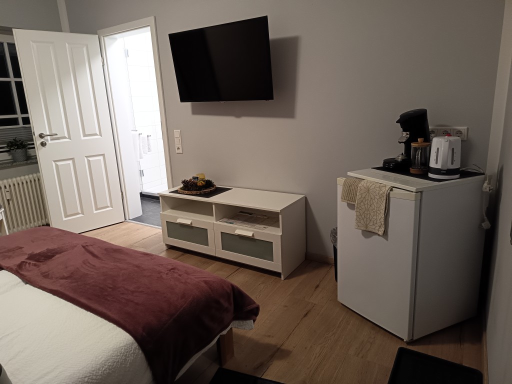 Schlafzimmer mit TV, leisem Kühlschrank, Kaffee-Padmaschine